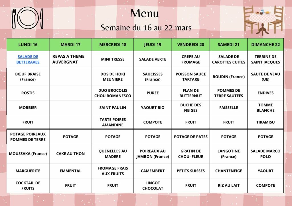 Le menu est consultable ci-dessous, il est susceptible de changer en fonction des livraisons, mais également de la météo (Adaptation de repas froids en période de canicule…).